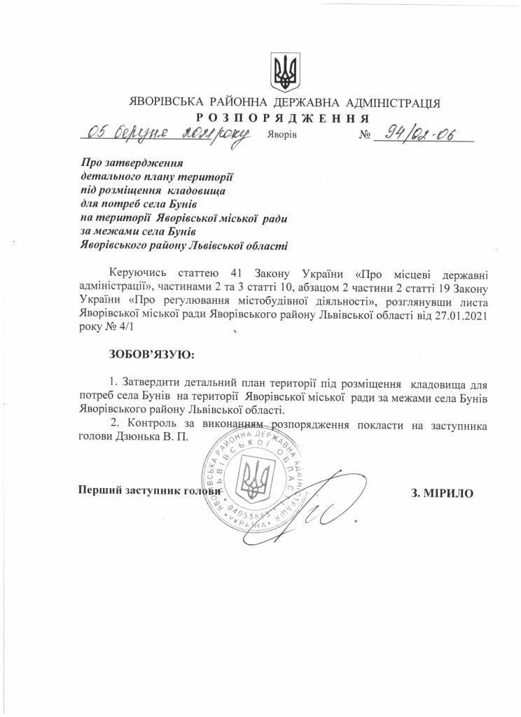 94/02-06 2021-03-05 Про затвердження детального плану території під розміщення кладовища для потреб села Бунів на території Яворівської міської ради за межами села Бунів Яворівського району Львівської області