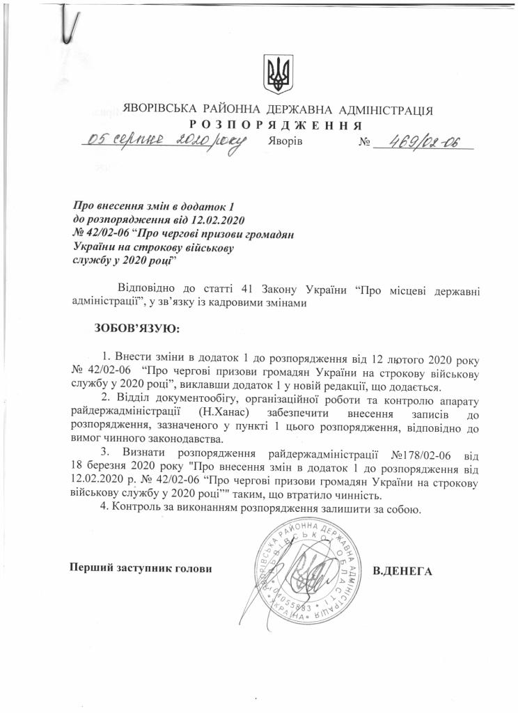 Про внесення змін в додаток 1 до розпорядження від 12.02.2020 № 42/02-06 "Про чергові призови громадян України на строкову військову службу у 2020 році" |