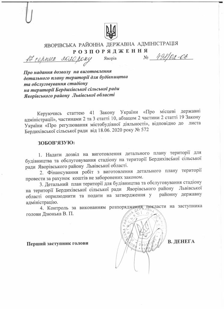 Про надання дозволу на виготовлення детального плану для будівництва та обслуговування стадіону на території Бердихівської сільської ради Яворівського району Львівської області |