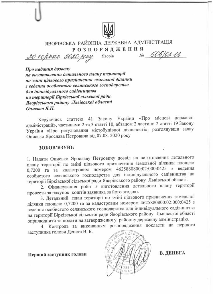 Про надання дозволу на виготовлення детального плану території по зміні цільового призначення земельної ділянки з ведення особистого селянського господарства для індивідуального садівництва на території Бірківської сільської ради Явоірвського району Львівської області Онисько Я.П |