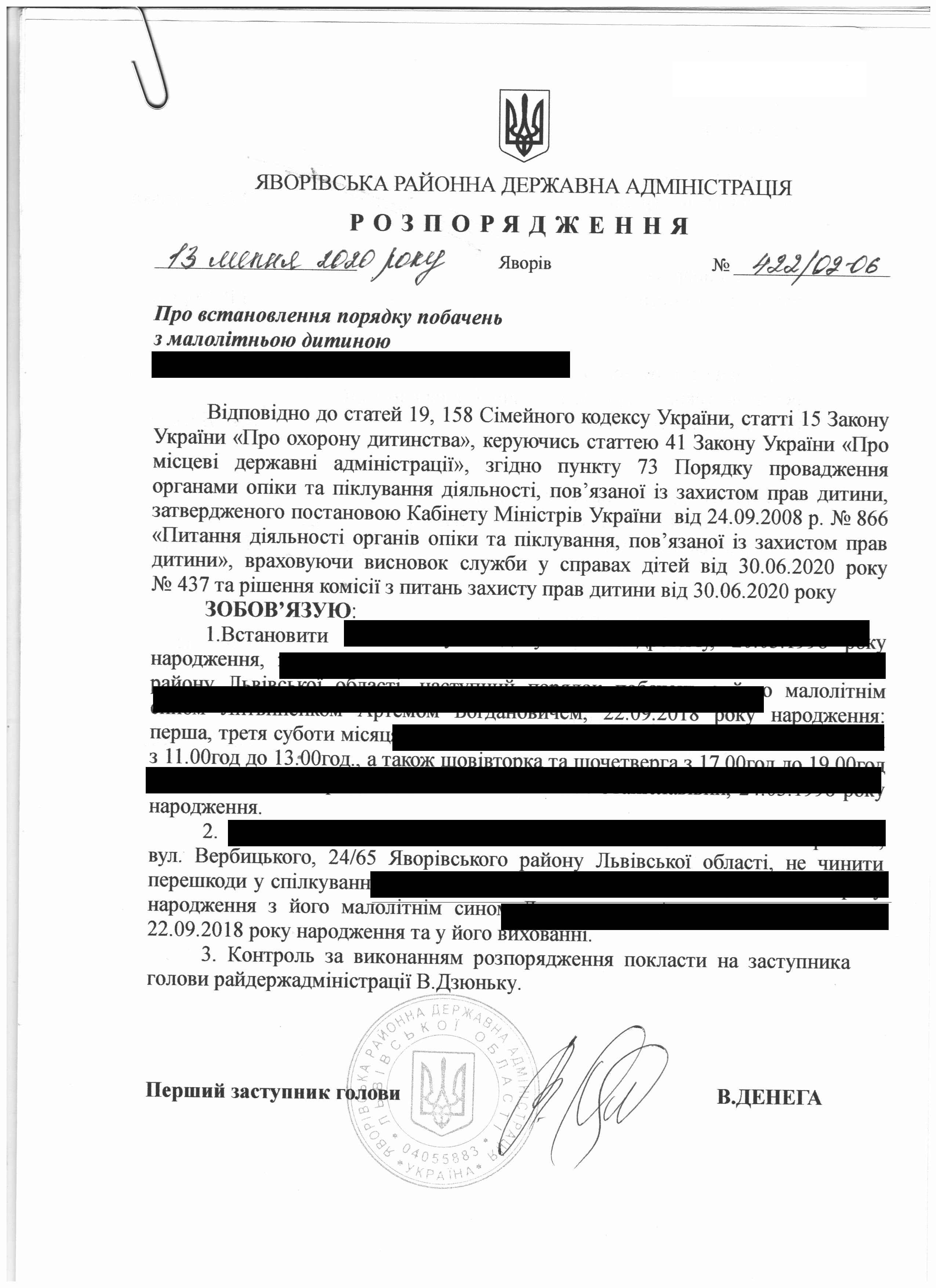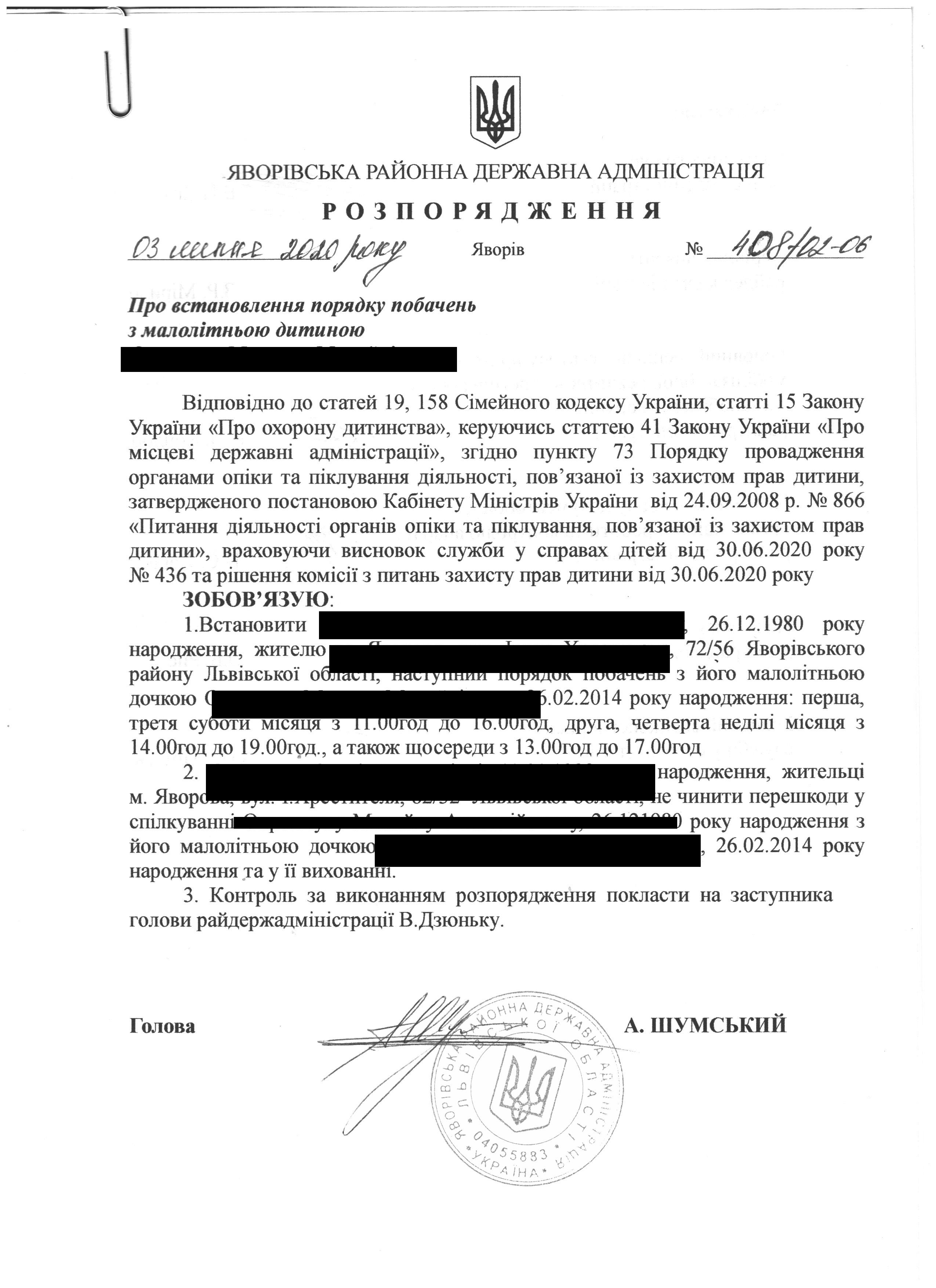 Про встановлення порядку побачень з малолітньою дитиною |