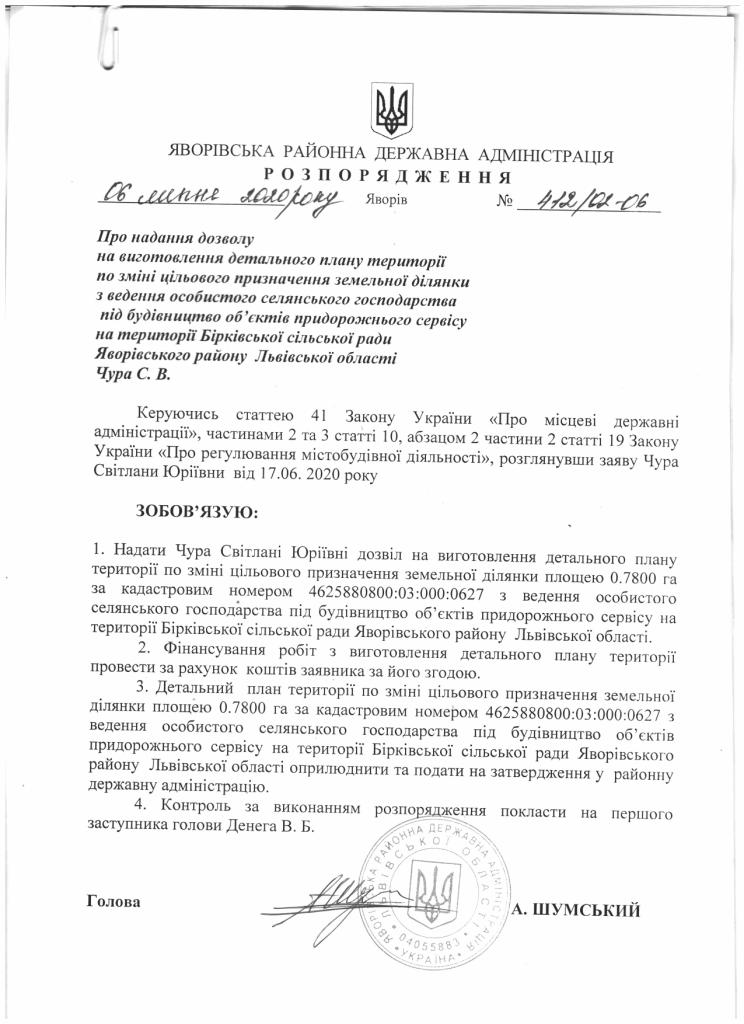 Про надання дозволу на виготовлення детального плану території по зміні цільового призначення земельної ділянки з ведення особистого селянського господарства під будівництво об'єктів придорожнього сервісу на території Бірківської сільської ради Яворівського району Львівської області Чура С.В. |