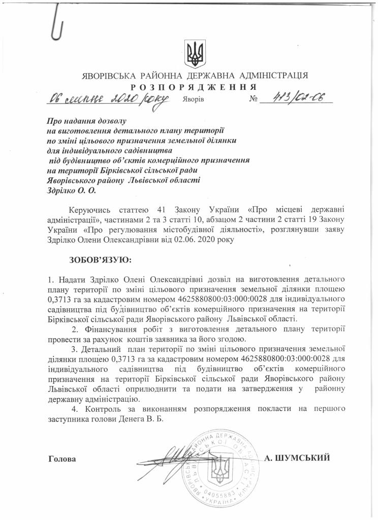 Про надання дозволу на виготовлення детального плану території по зміні цільового призначення земельної ділянки для індивідуального садівництва під будівництво об'єктів комерційного призначення на території Бірківської сільської ради Яворівського району Львівської області Здрілко О.О. |