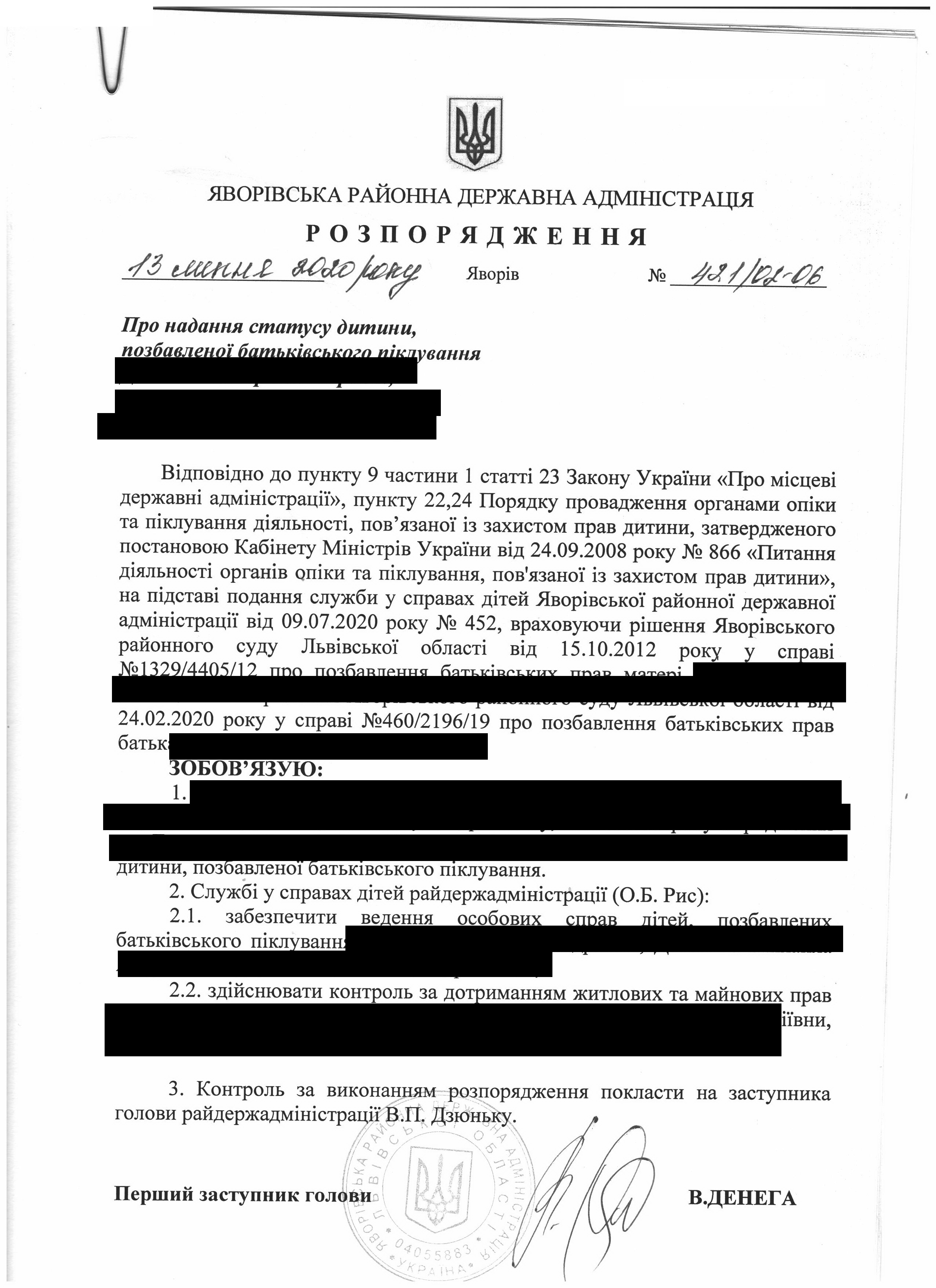 Про надання статусу дитини, позбавленої батьківського піклування |