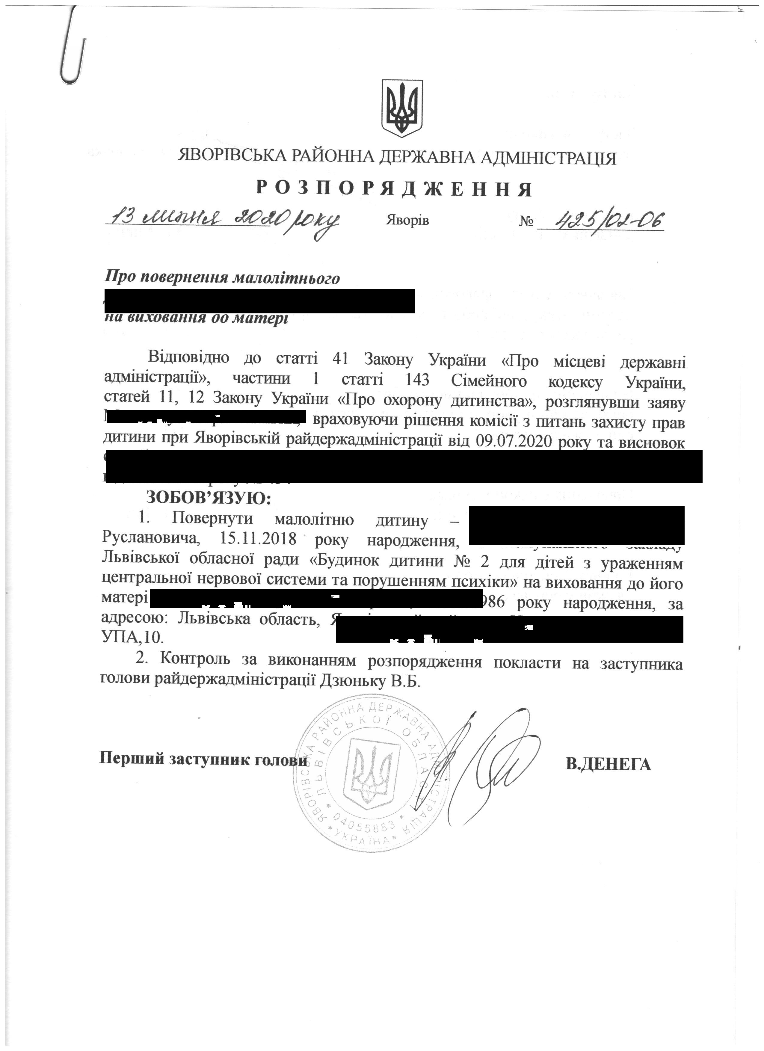 Про повернення малолітнього на виховання до матері |