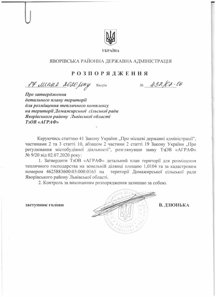 Про затвердження детального плану території для розміщення тепличного комплексу на території Домажирської сільської ради Яворівського району Львівської області ТзОВ "АГРАФ" |
