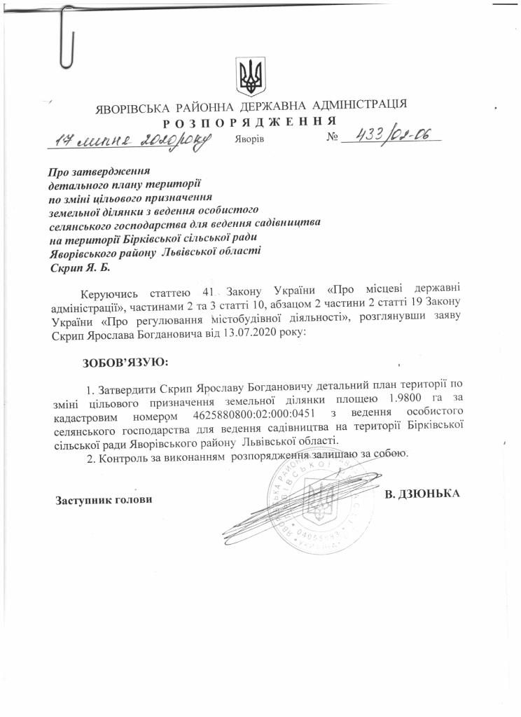 Про затвердження детального плану території по зміні цільового призначення земельної ділянки з ведення особистого селянського господарства для ведення садівництва на території Бірківської сільської ради Яворівського району Львівської області Скрип Я.Б |
