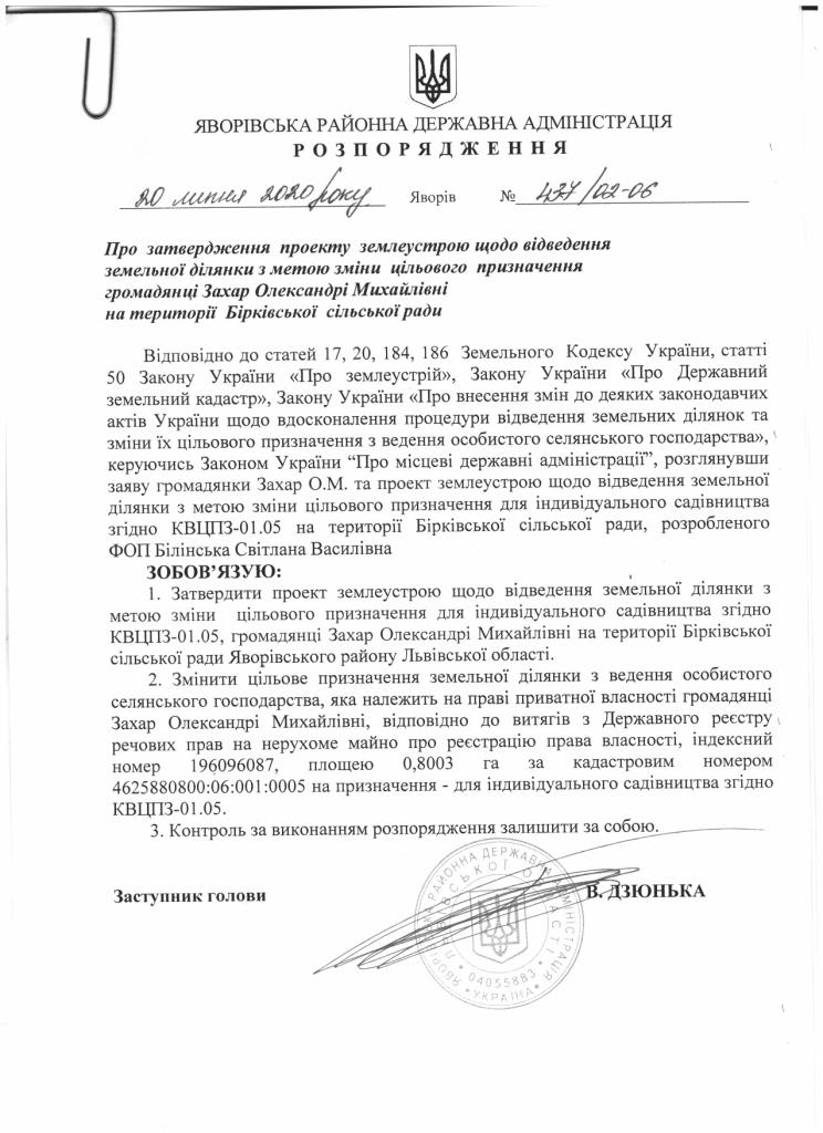 Про затвердження проекту землеустрою щодо відведення земельної ділянки з метою зміни цільового призначення громадянці Захар Олександрі Михайлівні на території Бірківської сільської ради |