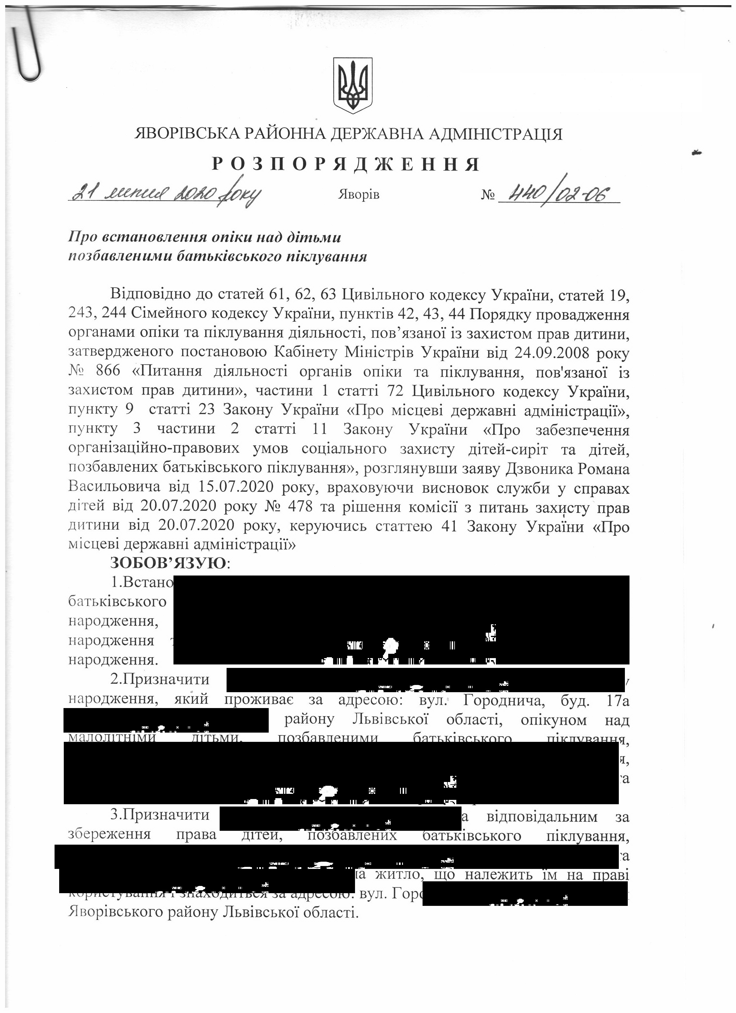 Про встановлення піклування над дитиною-сиротою |
