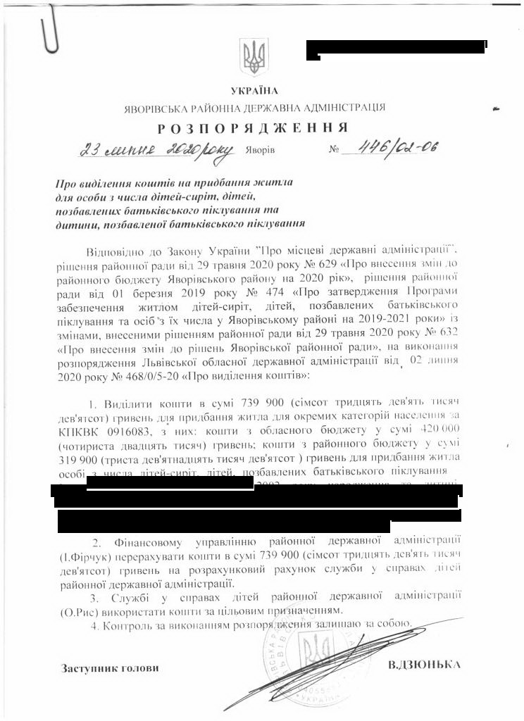 Про виділення коштів на придбання житла для особи з числа дітей-сиріт, дітей, позбавлених батьківського піклування та дитини, позбавленої батьківського піклування |