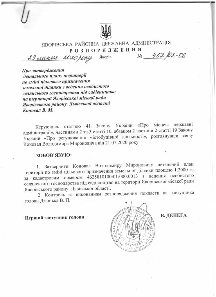 Про затвердження детального плану території по зміні цільового призначення земельної ділянки з ведення особистого селянського господарства під садівництво на території Яворівської міської ради Львівської області Коновал В.М. |