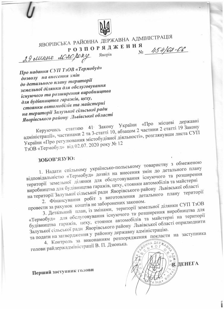Про надання СУП ТзОВ "Термобуд" дозволу на внесення змін до детального плану території земельної ділянки для обслуговування існуючого та розширення виробництва для будівництва гаражів, цеху, стоянки автомобілів та майстерні на території Залузької сільської ради Яворівського району Львівської області |