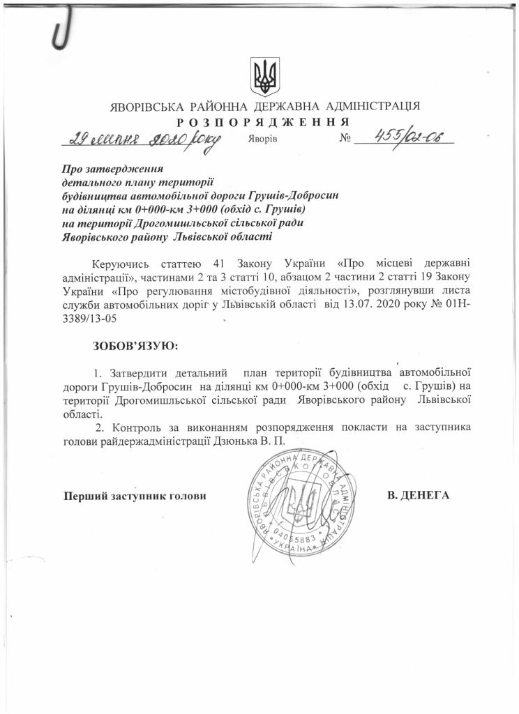 Про затвердження детального плану території будівництво автомобільної дороги Грушів-Добросин на ділянці км 0+000-км 3+000 (обхід с.Грушів) на території Дрогомишльської сільської ради Яворівського району Львівської області |