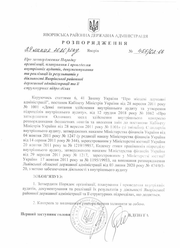 Про затвердження Порядку організації, планування і проведення внутрішніх аудитів, документування та реалізації їх результатів у діяльності Яворівської районної рержавної адміністрації та її структурних підрозділів |