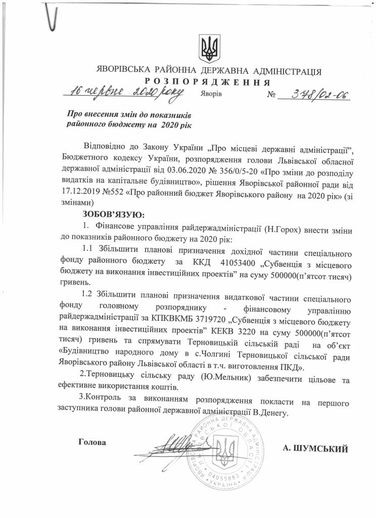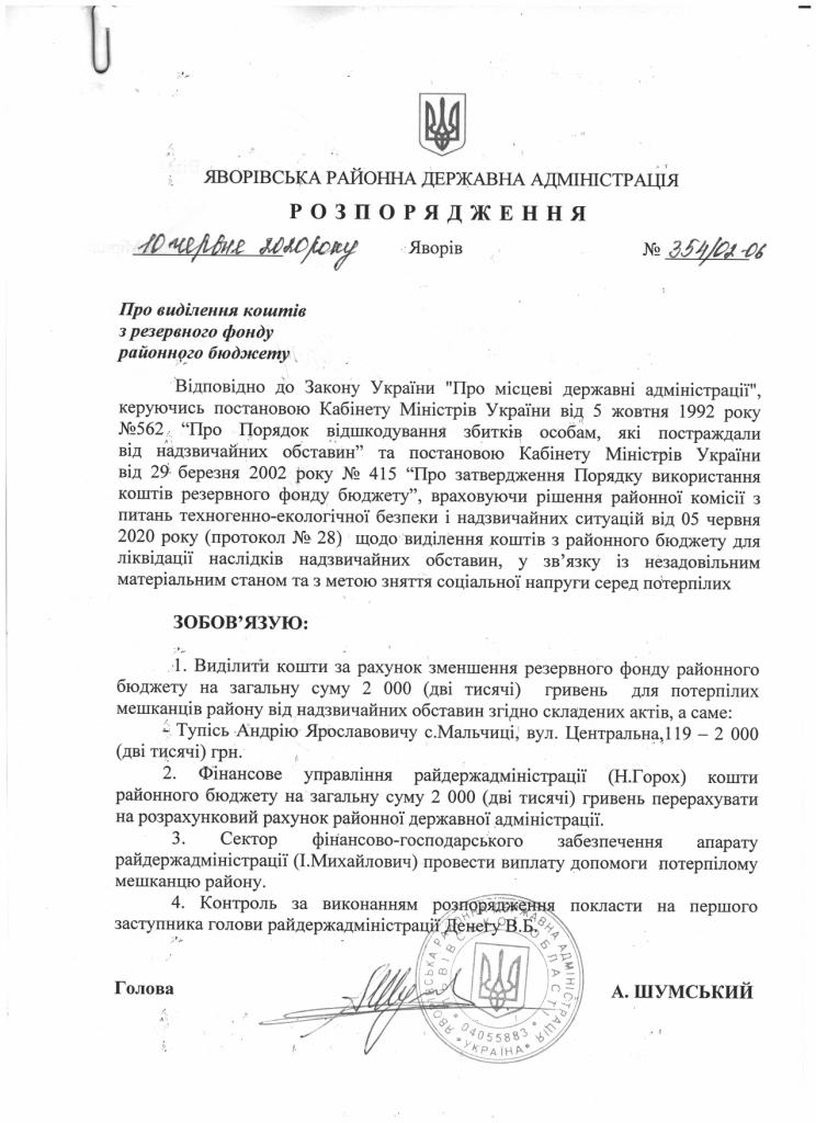354/02-06 2020-06-10 Про виділення коштів з резервного фонду районного бюджету