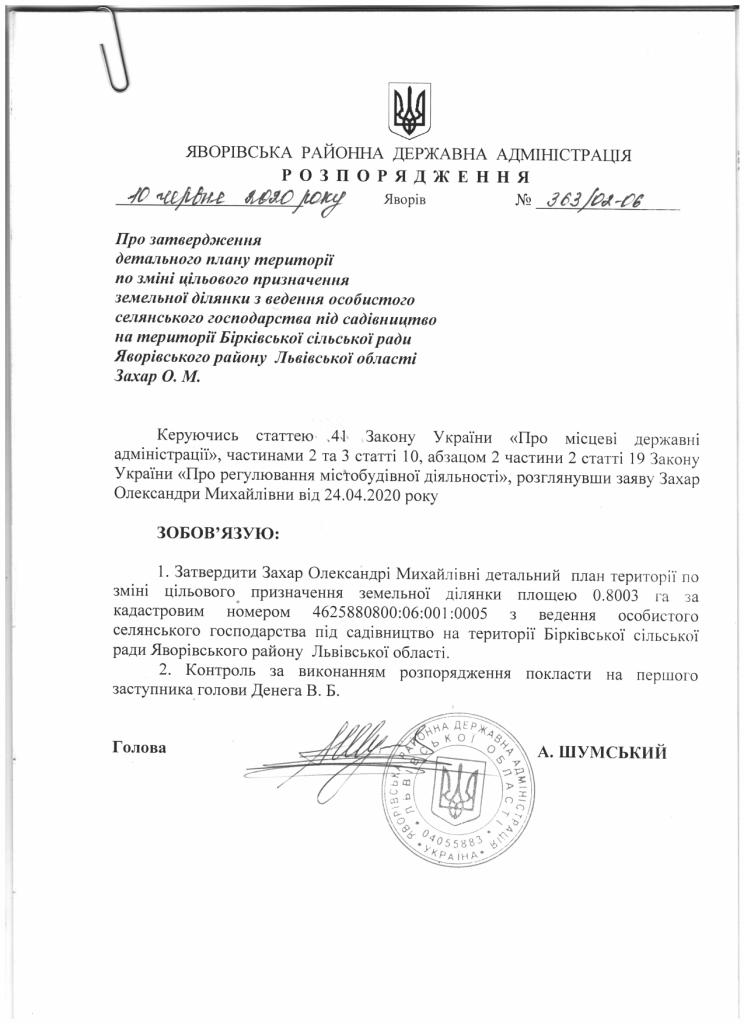 363/02-06 2020-06-10 Про затвердження детального плану території по зміні цільового призначення земельної ділянки з ведення особистого селянського господарства під садівництво на території Бірківської сільської ради Яворівського району Львівської області Захар О.М.