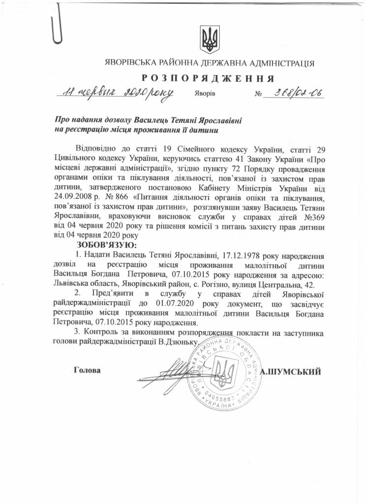 368/02-06 2020-06-11 Про надання дозволу Василець Тетяні Ярославівні на реєстрацію місця проживання її дитини