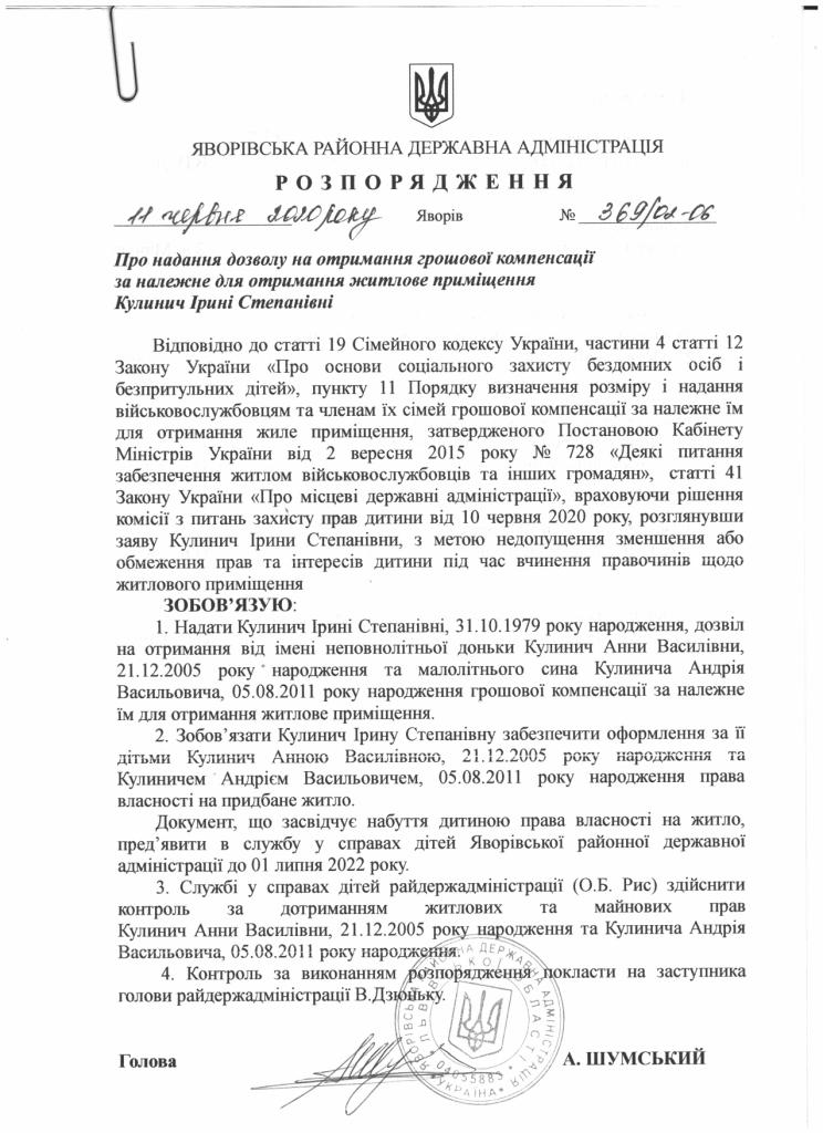 369/02-06 2020-06-11 Про надання дозволу на отримання грошової компенсації за належне для отримання житлове приміщення Кулинич Ірини Степанівні