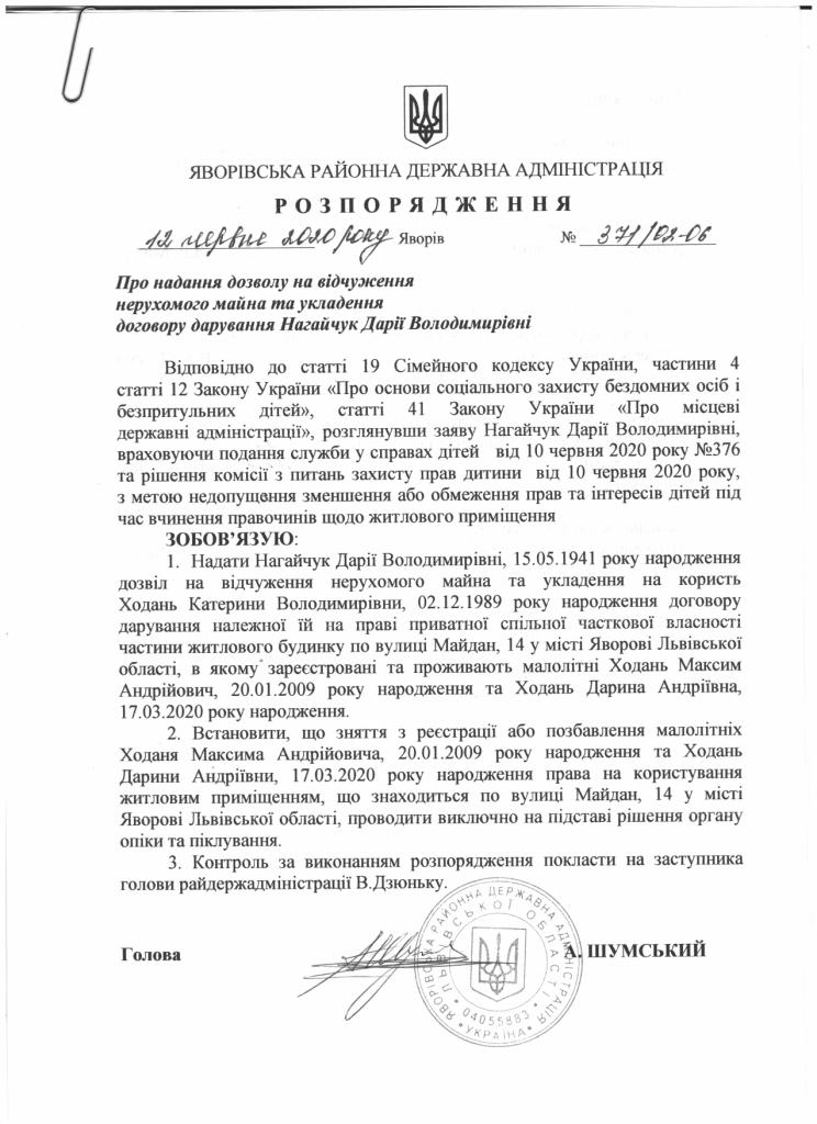 371/02-06 2020-06-12 Про надання дозволу на відчуження нерухомого майна та укладення договору дарування Нагайчук Дарії Володимирівні