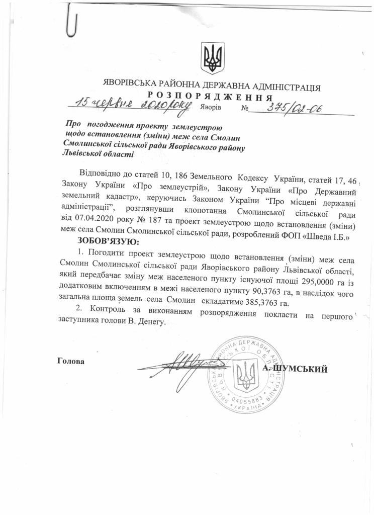 375/02-06 2020-06-15 Про погодження проекту землеустрою щодо встановлення (зміни) меж села Смолин Смолинської сільської ради Яворівського району Львівської області