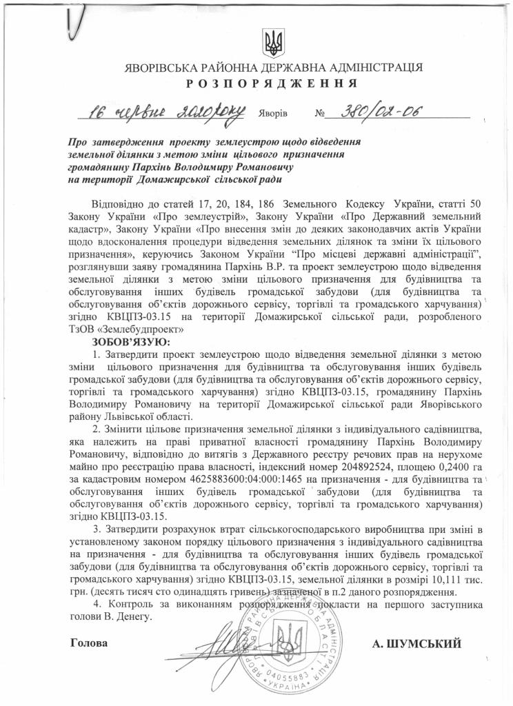 380/02-06 2020-06-16 Про затвердження проекту землеустрою щодо відведення земельної ділянки з метою зміни цільового призначення громадянину Пархінь Володимиру Романовичу на території Домажирської сільської ради