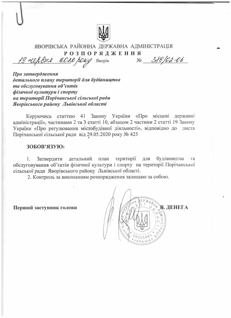 386-02-06 2020-06-19 Про затвердження детального плану території для будівництва та обслуговування об'єктів фізичної культури і спорту на території Порічанської сільської ради Яворівського Львівської області