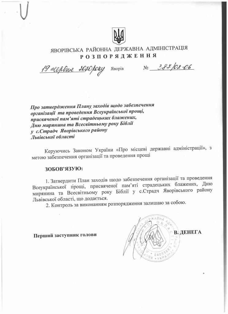 387/02-06 2020-06-19 Про затвердження Плану заходів щодо забезпечення організації та проведення Всеукраїнської прощі, присвяченої пам'яті страдецьких блажених, Дню мирянина та Всесвітньому року Біблії у с.Страдч Яворівського району Львівської області