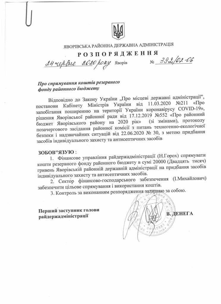 392/02-06 2020-06-24 Про спрямування коштів резервного фонду районного бюджету