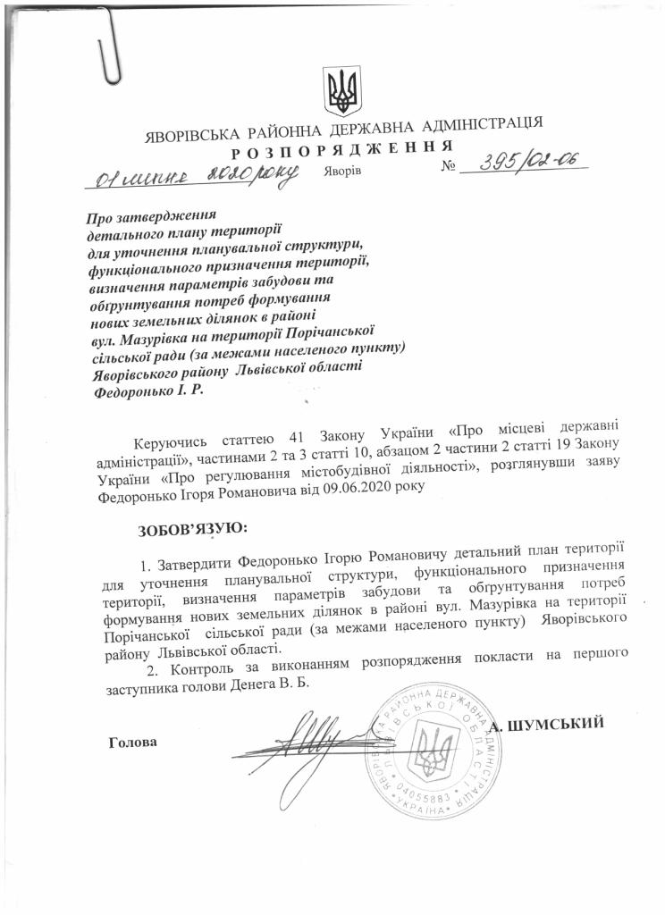 395/02-06 2020-07-01 Про затвердження детального плану території для уточнення плануваної структури, функціонального призначення території, визначення параметрів забудови та обгрунтування потреб формування нових земельних ділянок в районі вул. Мазурівка на території Порічанської сільської ради (за межами населеного пункту) Яворівського району Львівської області Федоронько І.Р.