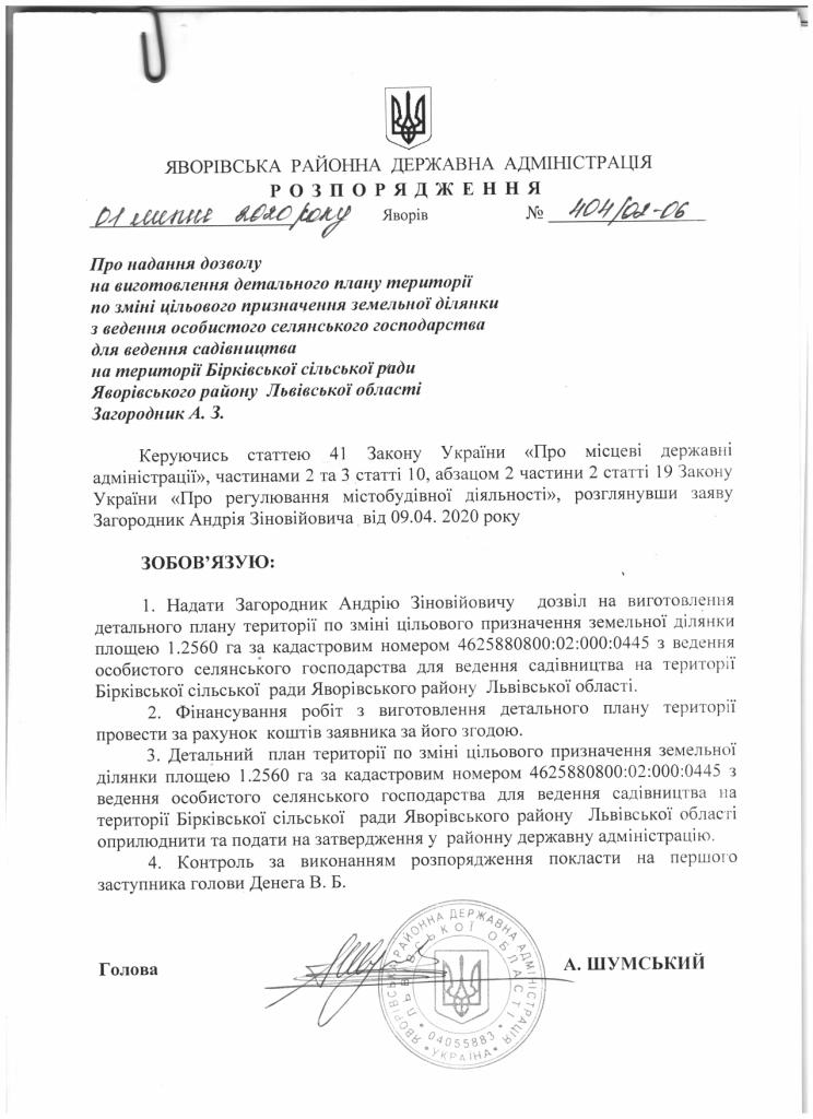 404/02-06 2020-07-01 Про надання дозволу на виготовлення детального плану території по зміні цільового призначення земельної ділянки для ведення садівництва на триторії Бірківської сільської ради Яворівського району Львівської області Загородник А.З.