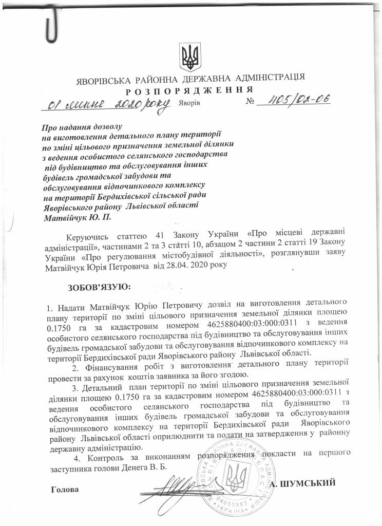 405/02-06 2020-07-01 Про надання дозволу на виготовлення детального плану території по зміні цільового призначення земельної ділянки з ведення особистого селянського господарства під будівництво та обслуговування інших будівель громадської забудови та обслуговування відпочинкового комплексу на території Бердихівської сільської ради Яворівського району Львівської області Матвійчук Ю.П