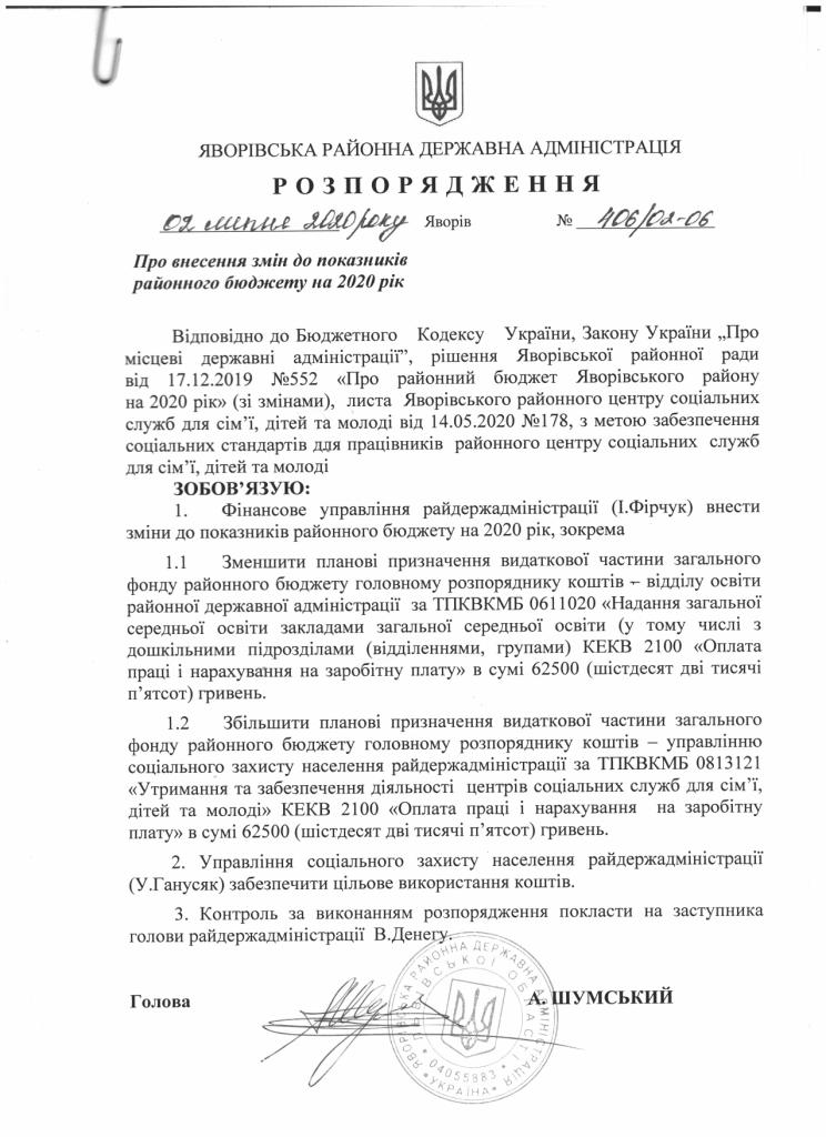 406/02-06 2020-07-02 Про внесення змін до показників районного бюджету на 2020 рік