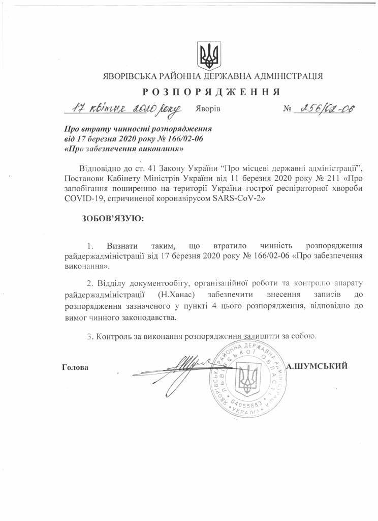 256/02-06 2020-04-17 Про втрату чинності розпорядження від 17 березня 2020 року № 166/02-06 "Про забезпечення виконання"