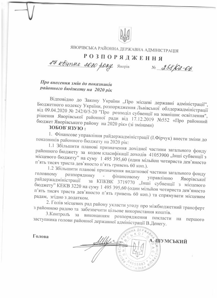 258/02-06 2020-04-17 Про внесення змін до показників районного бюджету на 2020 рік