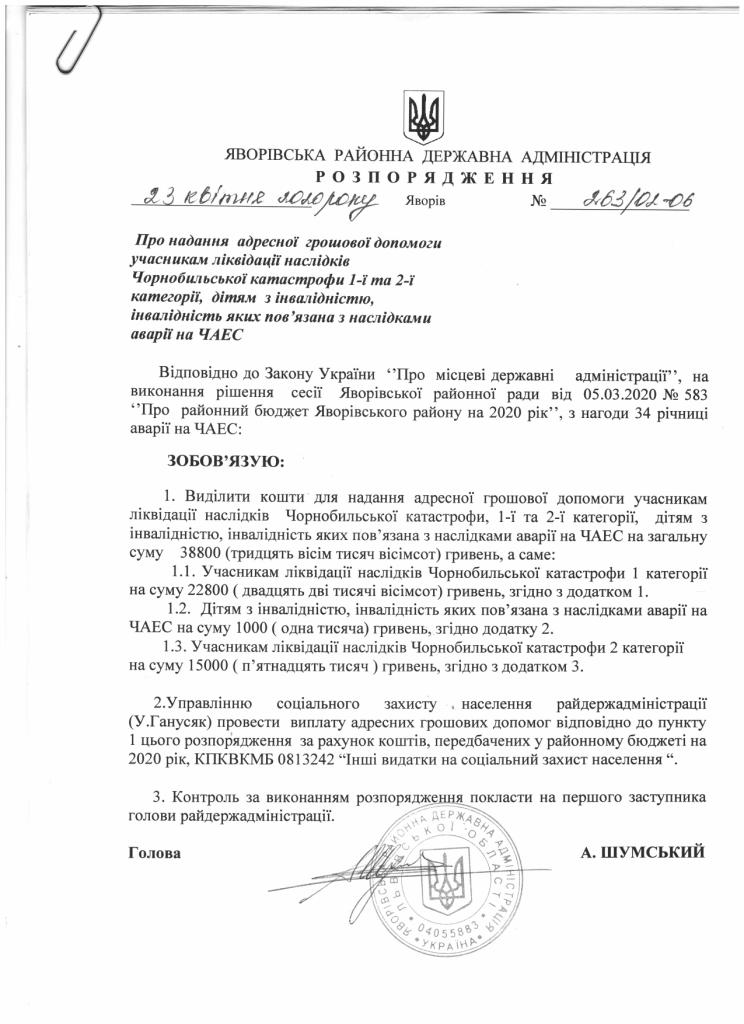 263/02-06 2020-04-23 Про надання адресної грошової допомоги учасникам ліквідації наслідків Чорнобильської катастрофи 1-ї та 2-ї категорії, дітям з інвалідністю, інвалідність яких пов'язана з наслідками аварії на ЧАЕС