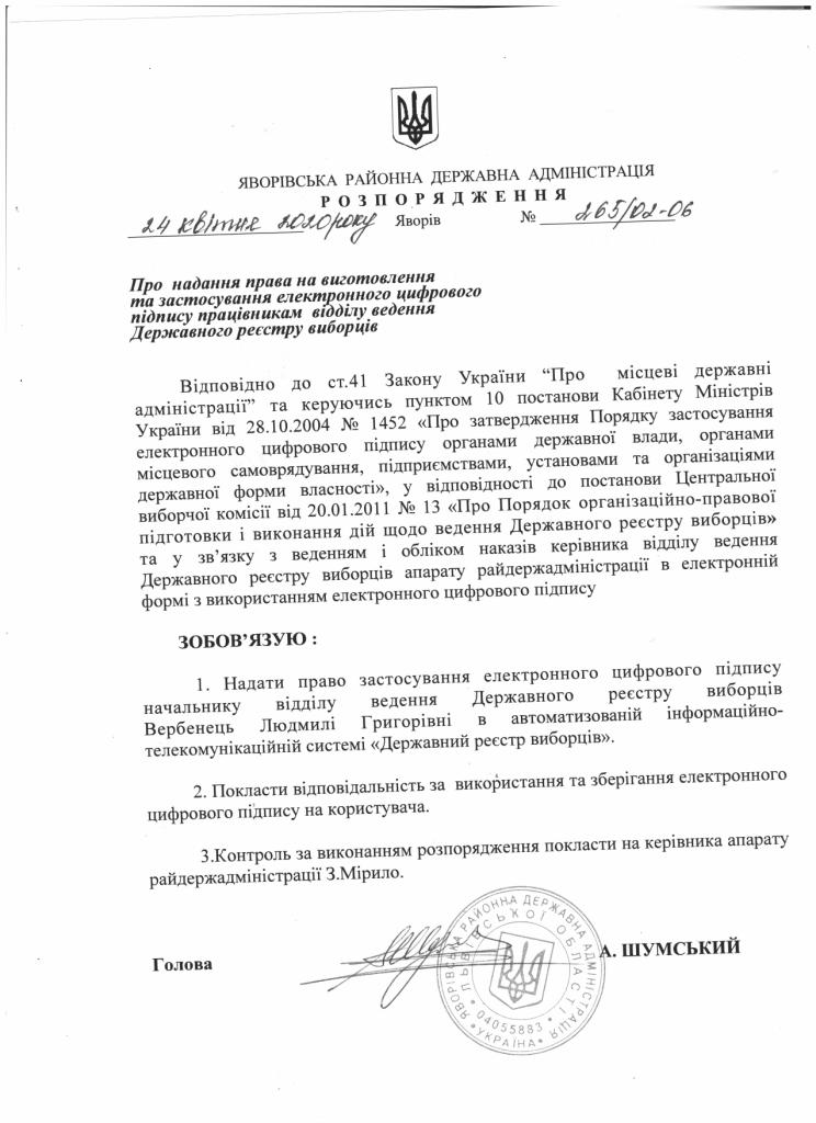 265/02-06 2020-04-24 Про надання права на виготовлення та застосування електроного цифрового підпису працівникам відділу ведення Державного реєстру виборців
