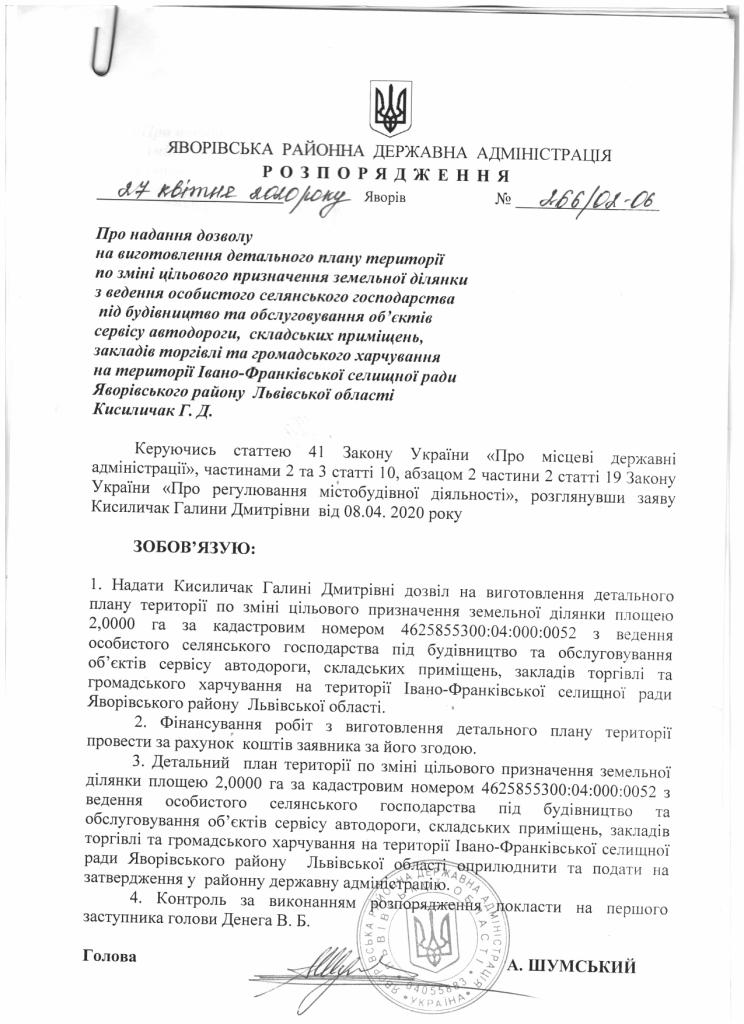 266/02-06 2020-04-27 Про надання дозволу на виготовлення детального плану території по зміні цільового призначення земельної ділянки з ведення особистого селянського господарства під будівництво та обслуговування об'єктів сервісу автодороги, складських приміщень, закладів торгівлі та громадського харчування на території Івано-Франківської селищної ради Яворівського району Львівської області