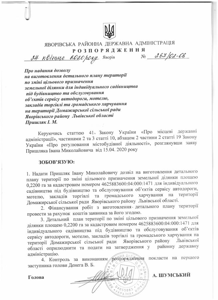 267/02-06 2020-04-27 Про надання дозволу на виготовлення детального плану території по зміні цільового призначення земельної ділянки для індивідуального садівництва під будівництво та обслуговування об’єктів сервісу автодороги, мотелю,закладів торгівлі та громадського харчування на території Домажирської сільської ради Яворівського району Львівської області Пришляк І.М