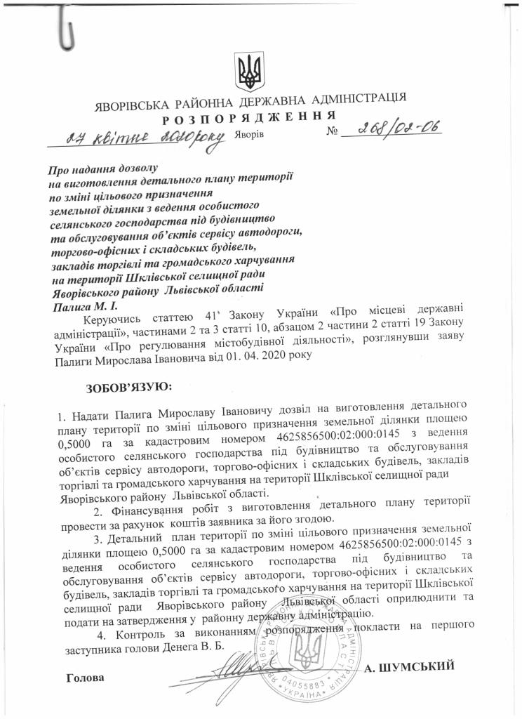 268/02-06 2020-04-27 Про надання дозволу на виготовлення детального плану території по зміні цільового призначення земельної ділянки з ведення особистого селянського господарства під будівництво та обслуговування об'єктів сервісу автодороги, торгово-офісних і складських будівель, закладів торгівлі та громадського харчування на території Шклівської селищної ради Яворівського району Львівської області
