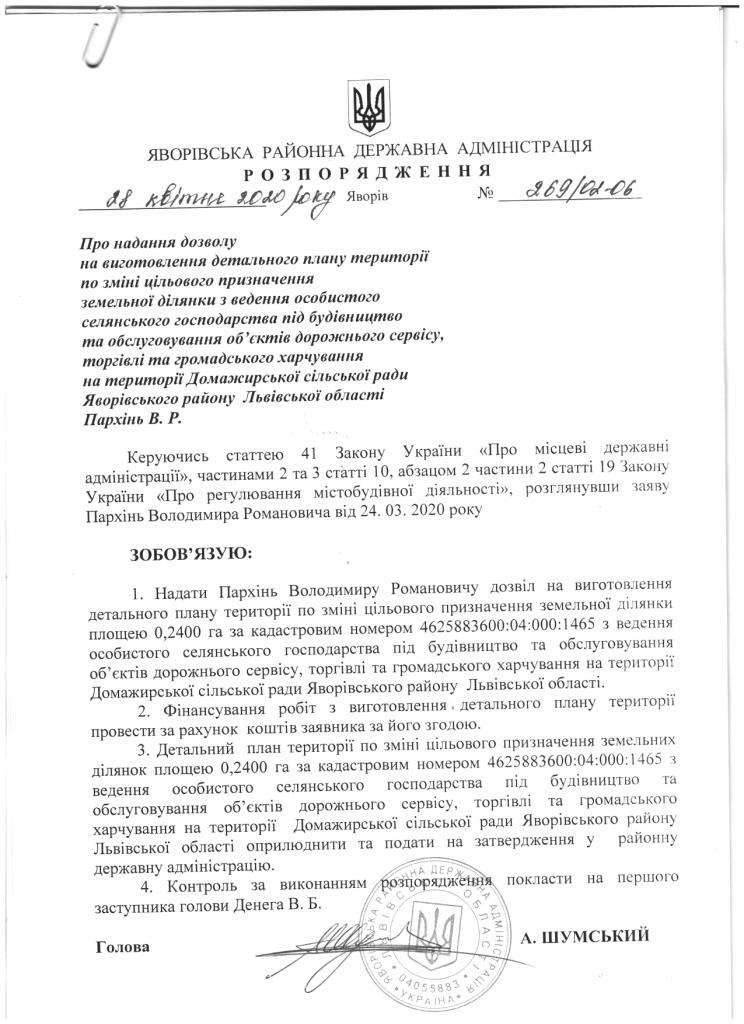 269/02-06 2020-04-28 Про надання дозволу на виготовлення детального плану території по зміні цільового призначення земельної ділянки для індивідуального садівництва під будівництво та обслуговування об’єктів сервісу автодороги, мотелю,закладів торгівлі та громадського харчування на території Домажирської сільської ради Яворівського району Львівської області Пархінь В.Р.