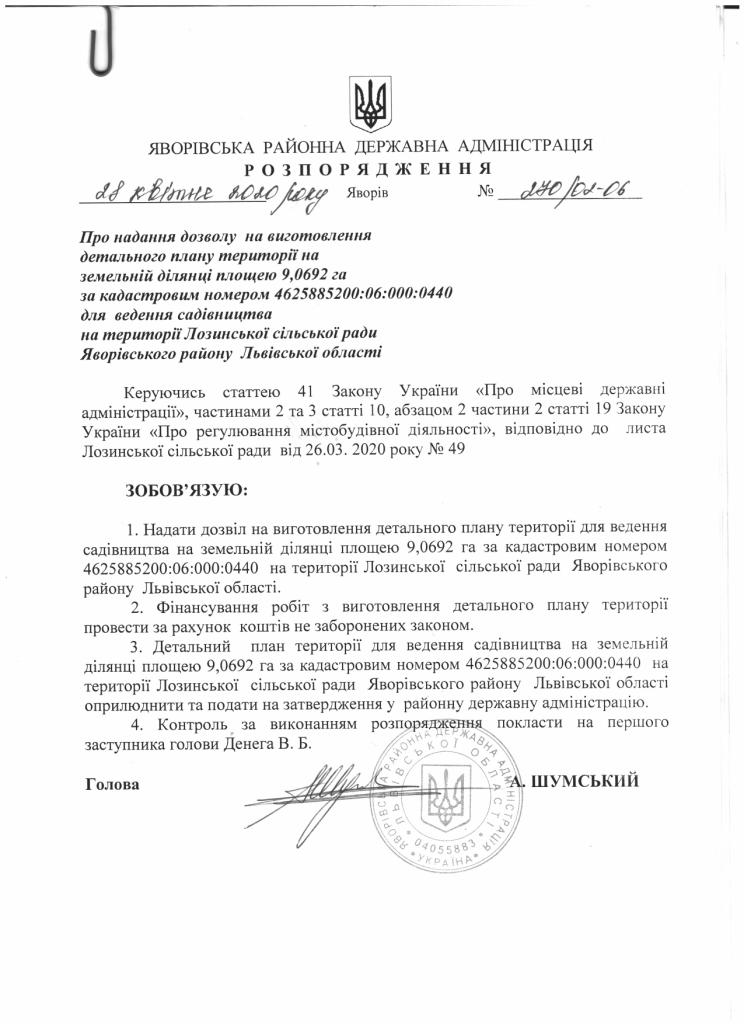 270/02-06 2020-04-28 Про надання дозволу на виготовлення детального плану території на земельній ділянці площею 9,0692 га за кадастровим номером 4625885200:060000440 для ведення садівництва на території Лозинської сільської ради Яворівського району Львівської області