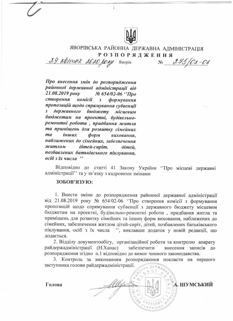 275/02-06 2020-04-29 Про внесення змін до розпорядження районної державної адміністрації від 21.08.2019 року № 654/02-06 "Про створення комісії з формування субвенції з державного бюджету місцевим бюджетам на проектні, будівельно -ремонтні роботи, придбання житла та приміщень для розвитку сімейних та інших форм виховання, наближених до сімейних, забезпечення житлом дітей-сиріт, дітей, позбавлених батьківського піклування, осіб з їх числа"