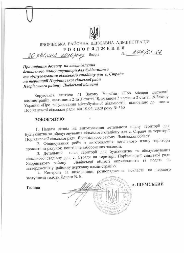 277/02-06 2020-04-30 Про надання дозволу на виготовлення детального плану території для будівництва та обслуговування сільського стадіону для с.Страдч на території Порічанської сільської ради Яворівського району Львівської області