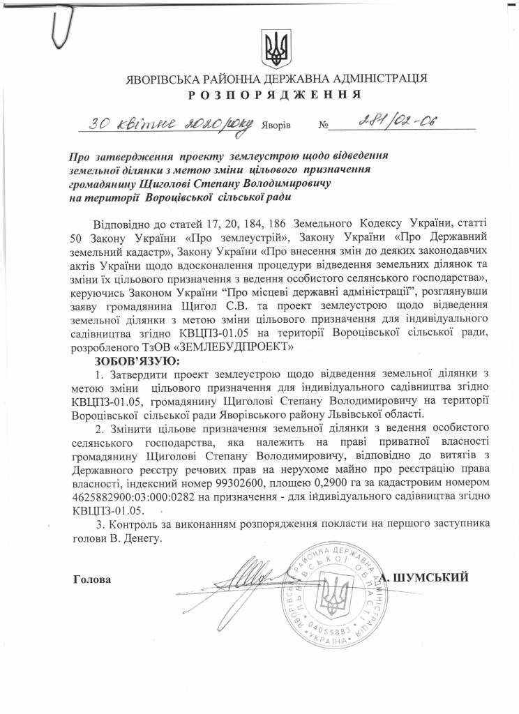281/02-06 2020-04-30 Про затвердження проекту землеустрою щодо відведення земельної ділянки з метою зміни цільового призначення громадянину Щиголові Степану Володимировичу на території Вороцівської сільської ради