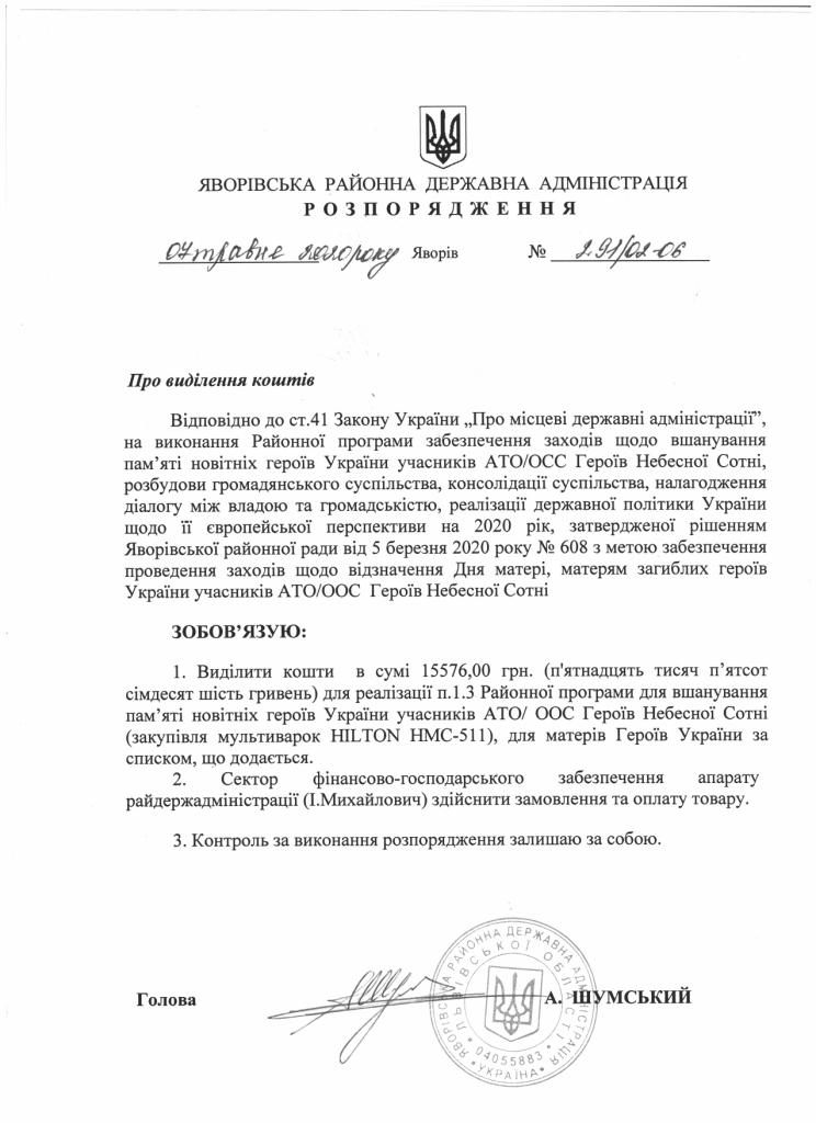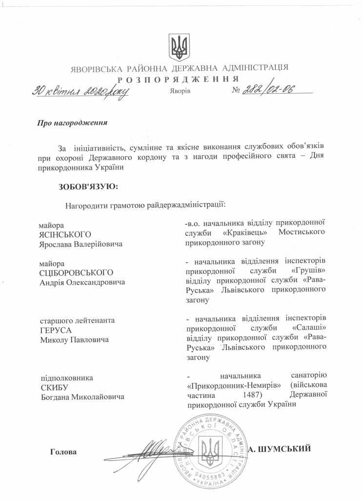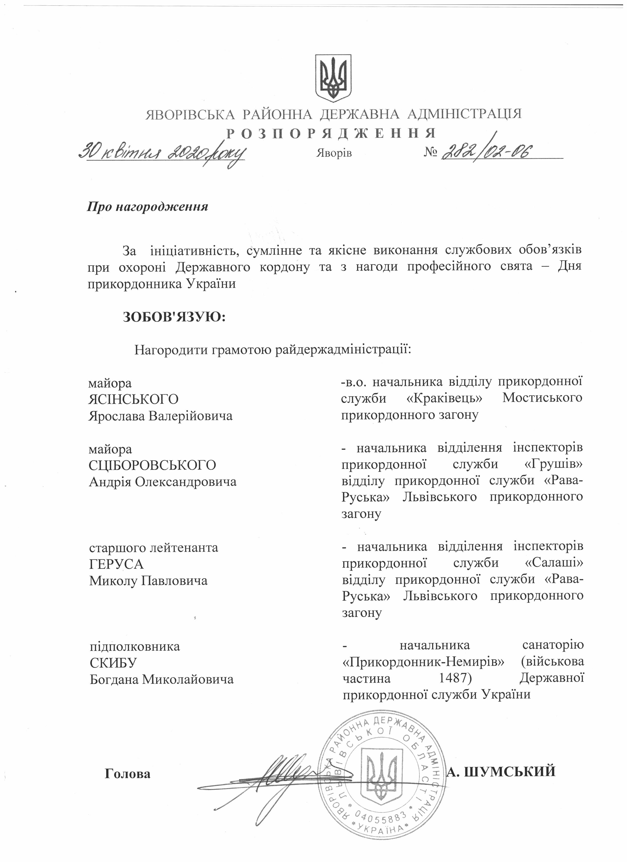 Про порядок організації і проведення в Яворівському районі заходів з підготовки громадян України до національного спротиву на 2026 рікПро внесення змін до розпорядження Яворівської районної військової адміністрації від 22.12.2025 року №73/02-06ВА ”Про районний бюджет Яворівського району на 2026 рік”Про затвердження Плану заходів із запобігання та виявлення корупції у Яворівській районній державній адміністрації на 2026 рікПро внесення змін до розпорядження районної військової адміністрації від 05 січня 2026 року Nº 1/02-06 ВА “Про стан військового обліку на території Яворівського району у 2025 році та завдання на 2026 рік та проведення перевірки технічного стану транспортних засобів на підприємствах, установах, організаціях та їх готовності до передачі військовим формуванням на період мобілізації та на воєнний час “Про нагородження(не підлягає оприлюдненню)Про розподіл асигнувань загального фонду державного бюджету на 2026 рікПро нагородженняПро стан війського обліку на території Яворівського району у 2025 році та завдання на 2026 рік та проведення перевірки технічного стану транспортних засобів на підприємтсвах, установах, організаціях та їх готовності до передачі військовим формуванням на період мобілізації та на воєнний станДСК (не підлягає оприлюдненню)Про затвердження планів роботи структурних підрозділів Яворівської районної державної адміністрації