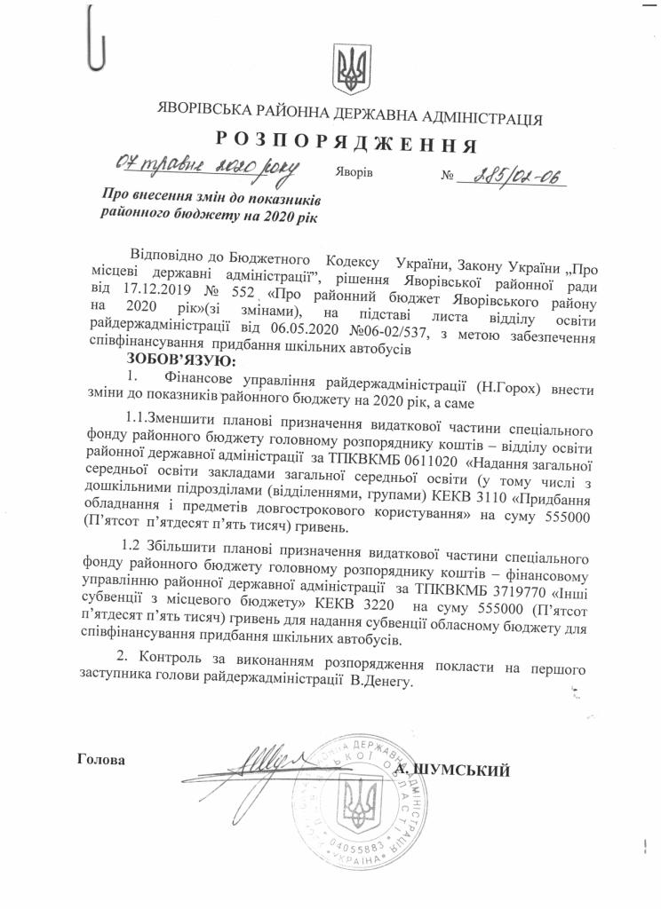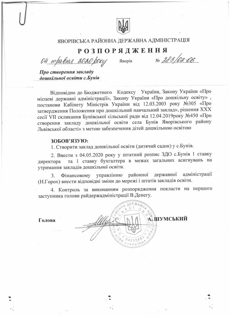 283/02-6 2020-05-04 Про створення закладу дошкільної освіти с.Бунів