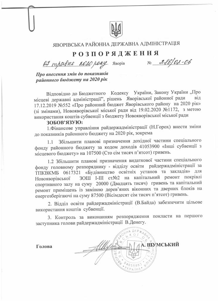286/02-06 2020-05-07 Про внесення змін до показників районного бюджету на 2020 рік