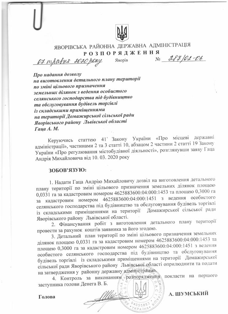 287/02-06 2020-05-07 Про надання дозволу на виготовлення детального плану території по змінні цільового призначення земельних ділянок з ведення особистого селянського господарства під будівництво та обслуговування будівель торгівлі із складськими приміщеннями на території Домажирської сільської ради Яворівського району Львівської області Гаца А.М.