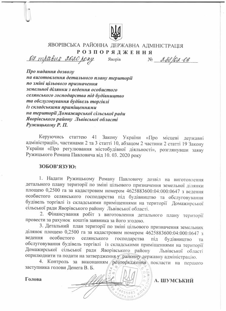 288/02-06 2020-05-07 Про надання дозволу на виготовлення детального плану території земельної ділянки з ведення особистого селянського господарства під будівництво та обслуговування будівель торгівлі із складськими приміщеннями на території Домажирської сільської ради Яворівського району Львівської області Ружицькому Р.П.
