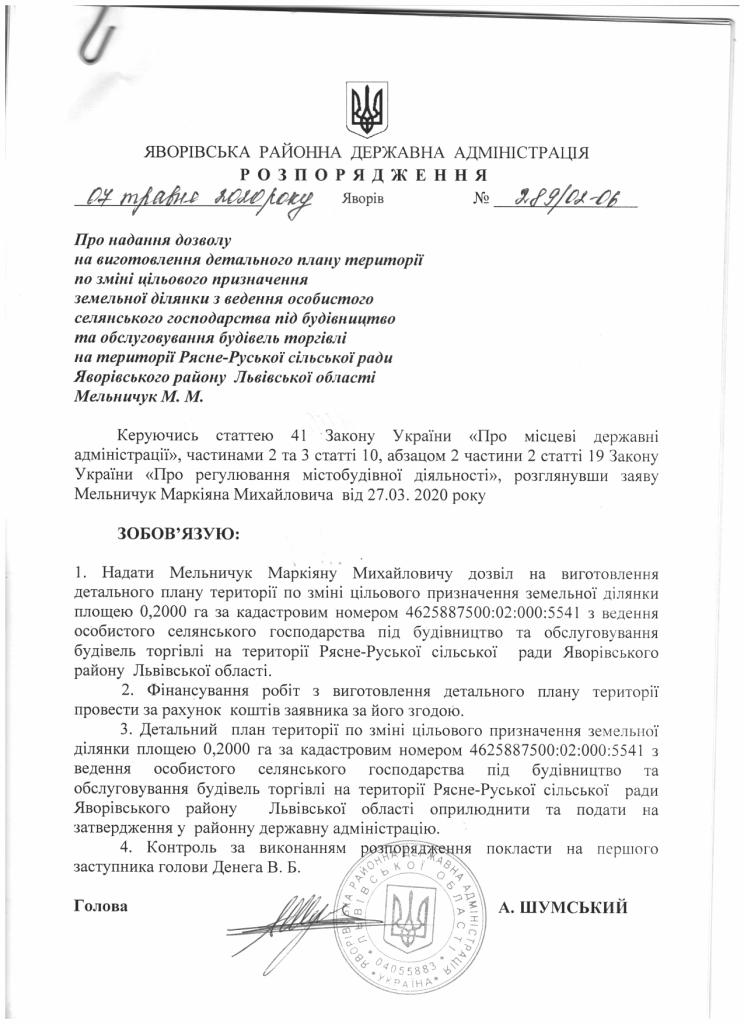 289/02-06 2020-05-07 Про надання дозволу на виготовлення детального плану території по змінні цільового призначення земельної ділянки з ведення особистого селянського господарства під будівництво та обслуговування будівель торгівлі на території Рясне - Руської сільської ради Яворівського району Львівської області